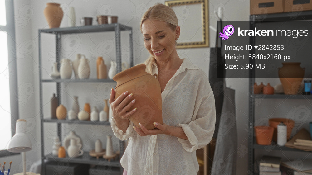 Blonde woman smiles while holding large terracotta pot in bright studio; calm creative inspiration.