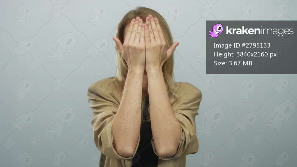 Blonde woman smiling with arms raised in a beige blazer against a white background, conveying joy and confidence in a professional setting.