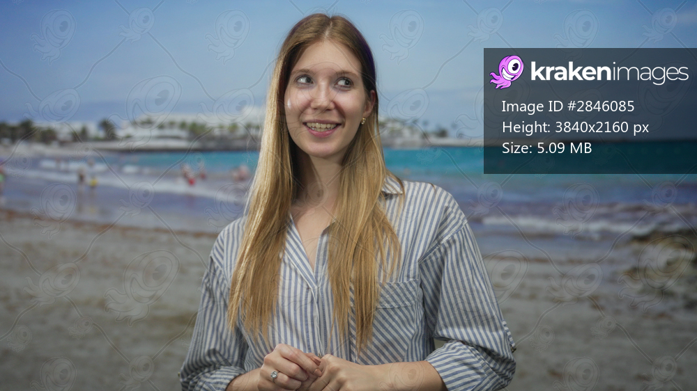 Blonde woman smiling with clasped hands at sunlit beach shoreline overlooking turquoise sea; holiday relaxation joy.