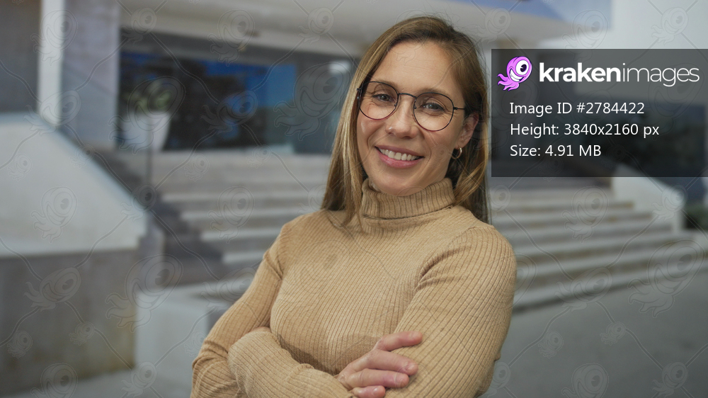 Blonde woman smiling confidently outdoors in an urban setting wearing glasses and a sweater, embodying youthful charm and modern style against a city backdrop. - Kraken Images
