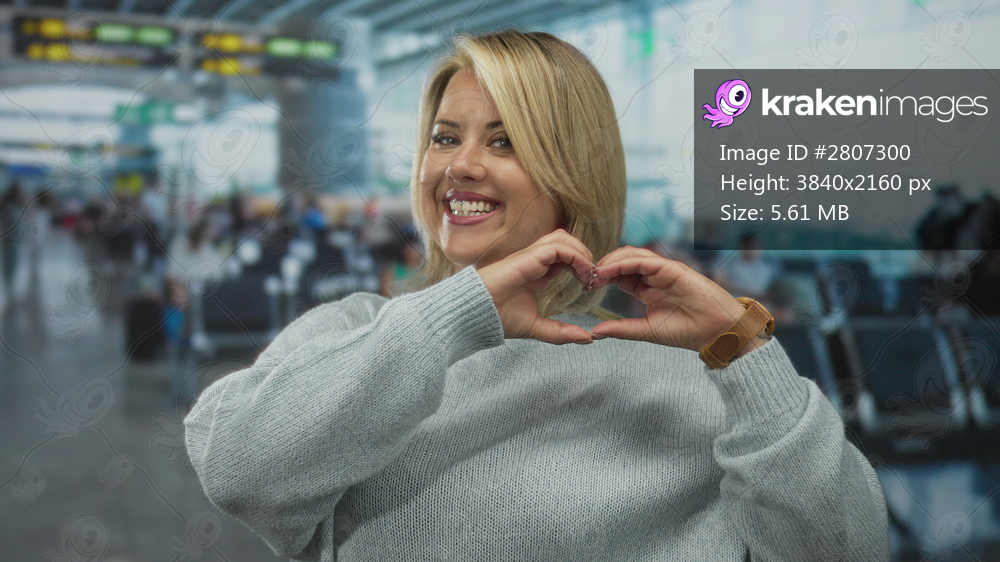 Blonde woman smiling and forming a heart shape with her hands near passenger seats by a gate in modern airport terminal; love.