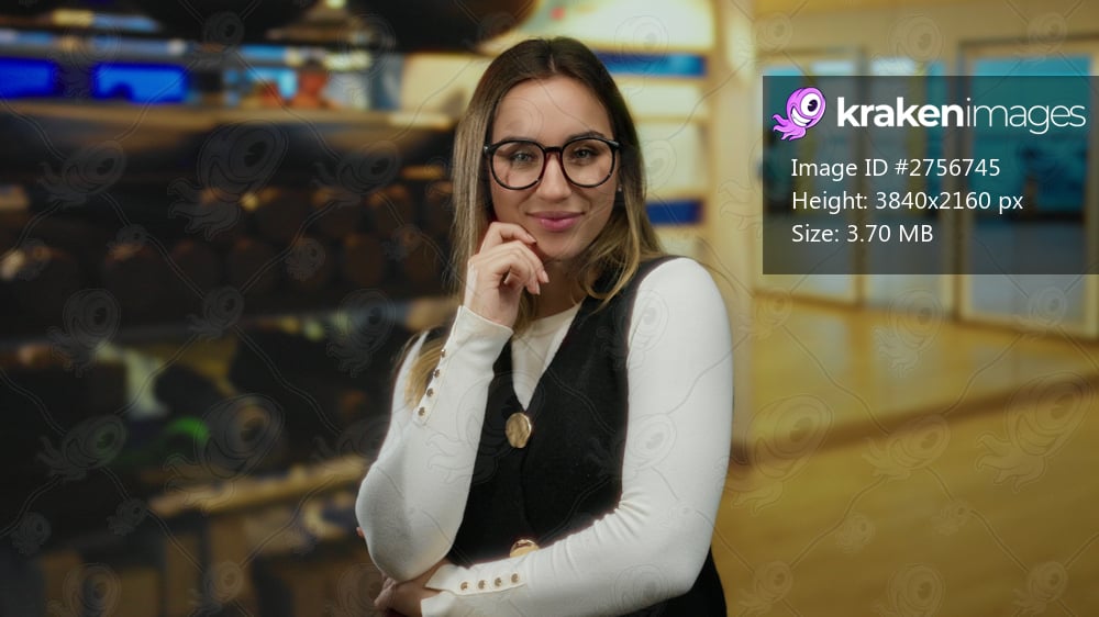 Blonde woman smiling indoors at gym wearing glasses, against a background of workout equipment and mirrors.