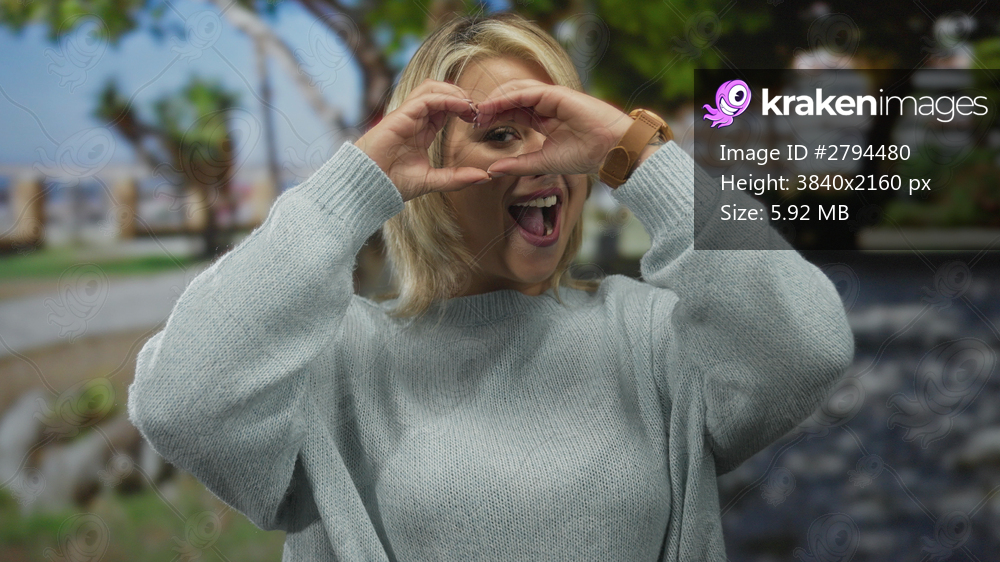 Blonde woman smiling makes heart gesture in park under bright green trees beside stone walkway; affection.