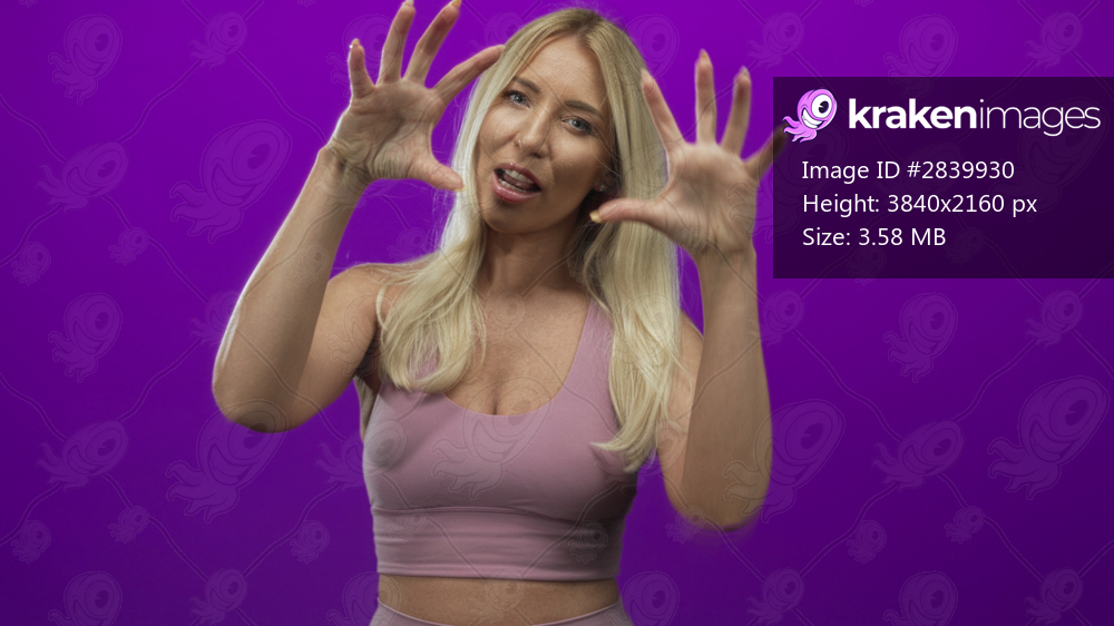 Blonde woman smiling showing expressive hands shaped as claws in purple studio setting; joy confidence creativity motivation.