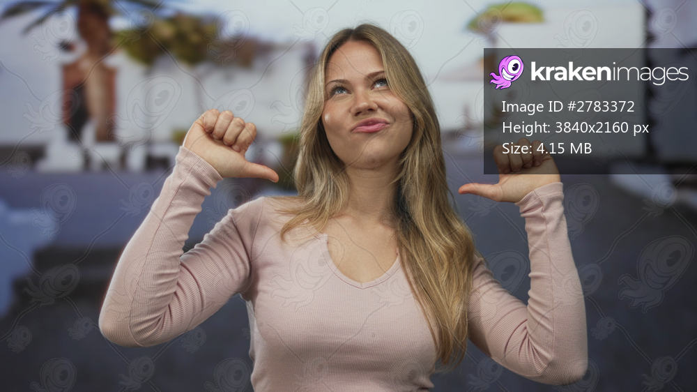 Blonde woman smiling and showing thumbs to chest wearing pink shirt on sunlit street outdoors; confidence pride.