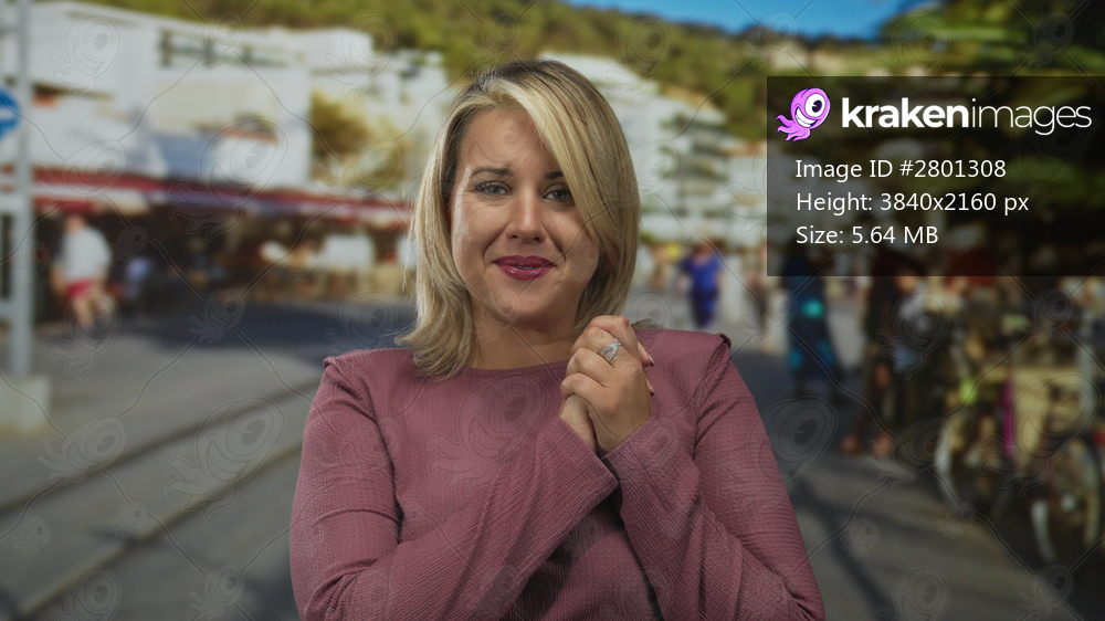Blonde woman smiling softly and clasping hands to chest on a bustling sunlit street; gratitude relief hope.