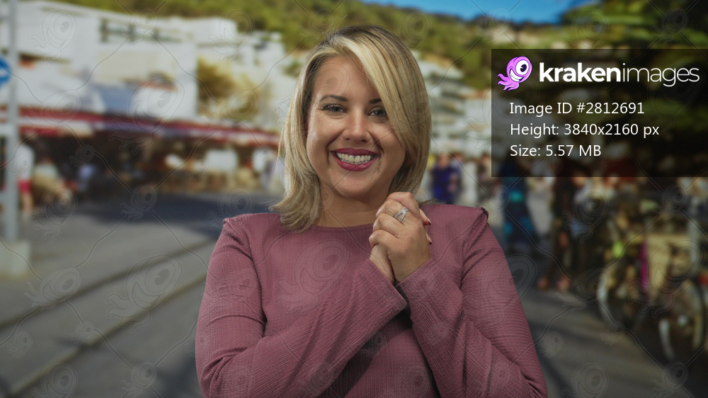 Blonde woman smiling softly and clasping hands to chest on a bustling sunlit street; gratitude relief hope.
