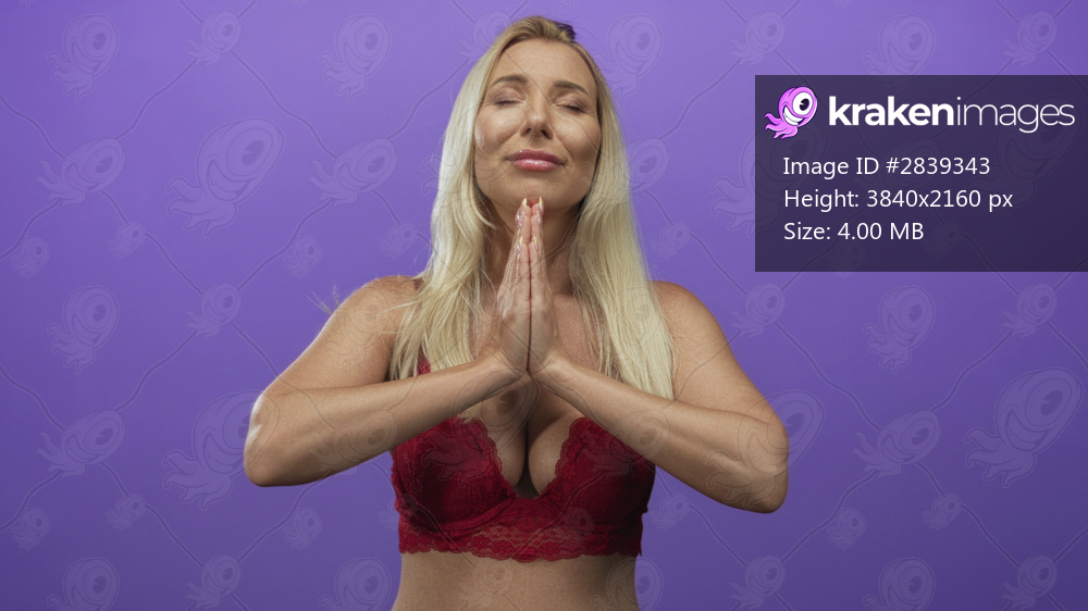 Blonde woman standing in red lace bra with hands pressed in prayer at a purple studio; serenity faith devotion.