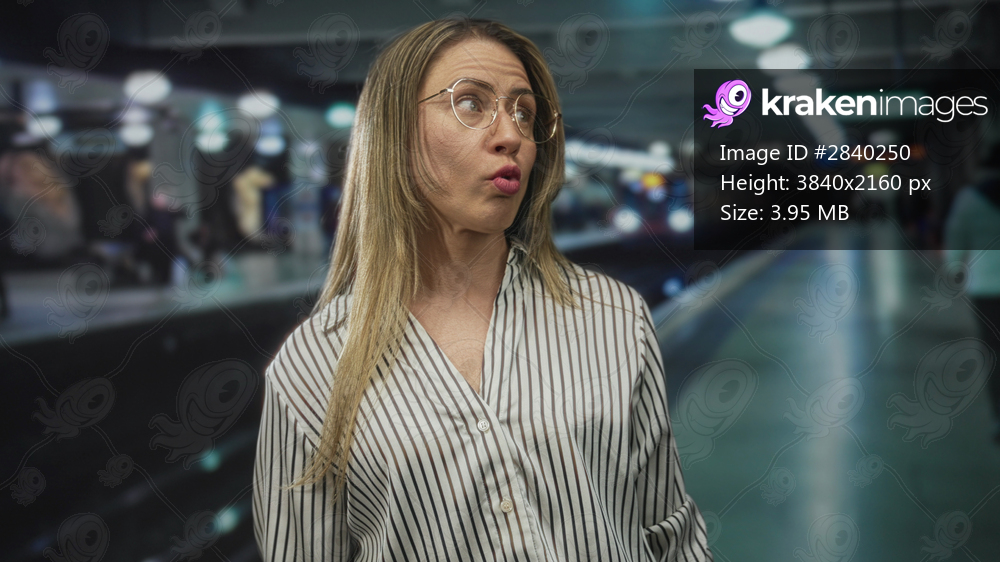 Blonde woman with striped shirt and round glasses purses lips inside train station building; curiosity.