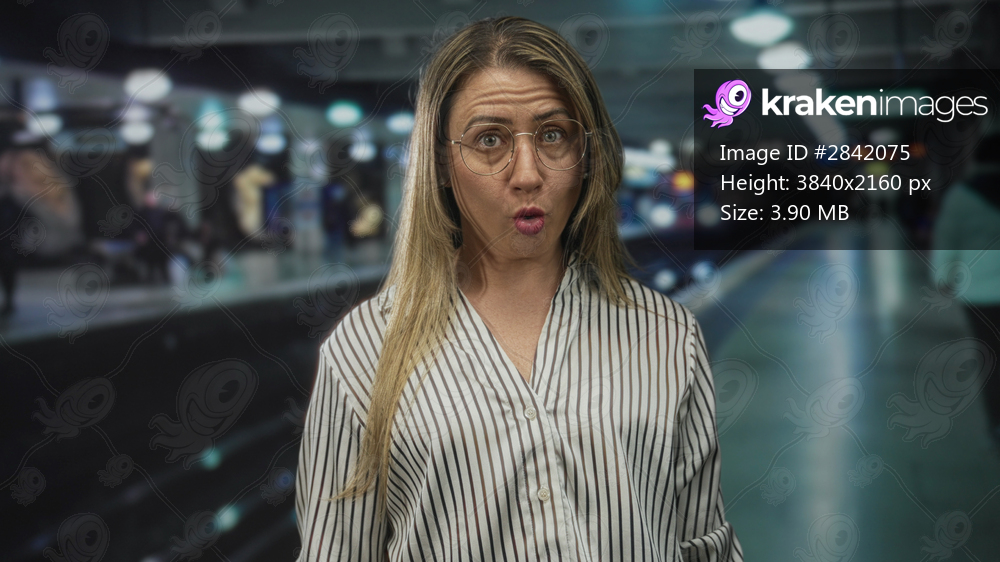 Blonde woman with striped shirt and round glasses purses lips inside train station building; curiosity.