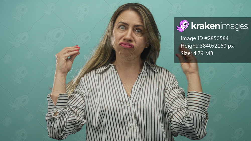 Blonde woman talking with hands in turquoise studio; communication expressiveness emphasis frustration.