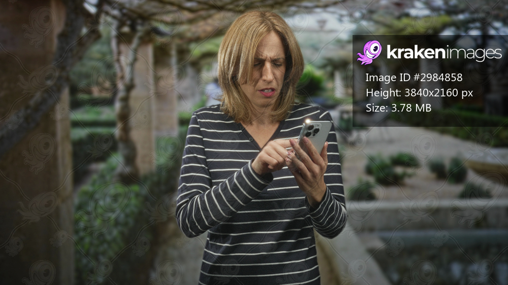 Blonde woman tapping smartphone with index finger in building courtyard, grimacing as she scrolls; frustration technology problem.