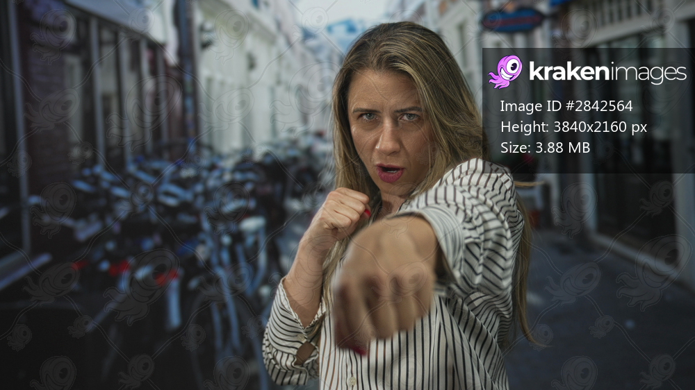 Blonde woman throws punch towards camera in narrow city street with parked bicycles on sidewalk; confidence resilience.