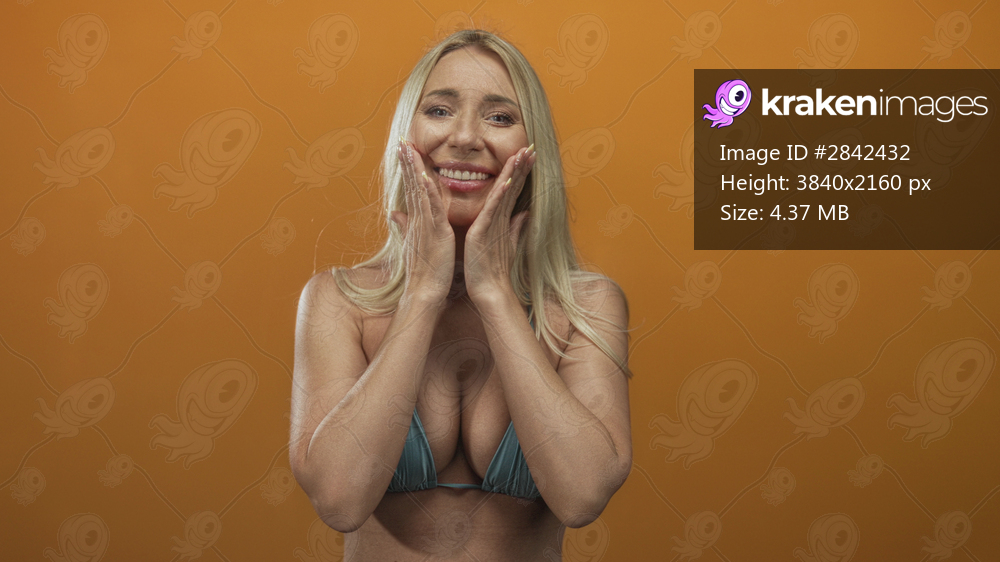 Blonde woman touches chest with hand wearing blue bikini top in orange studio; gratitude.