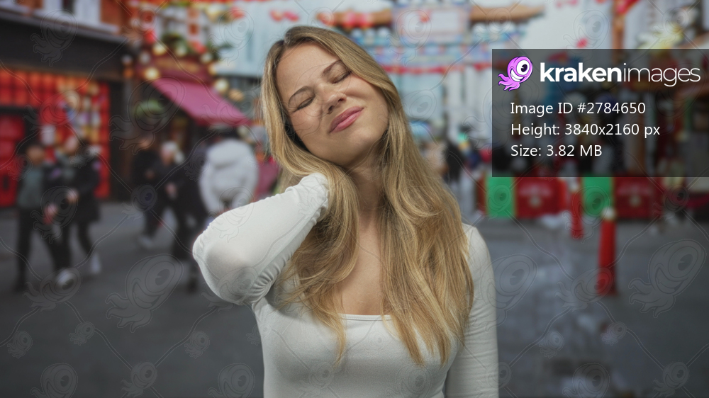 Blonde woman touches neck with hand amid a bustling crowded london street scene; pain discomfort soreness.