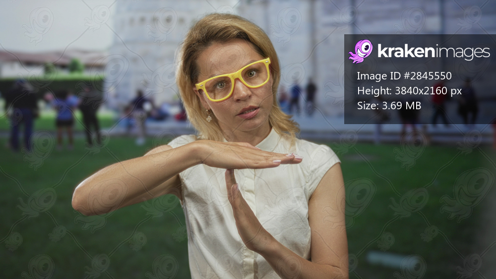 Blonde woman tourist hand forming timeout sign in front of the leaning tower of pisa building; reflection.