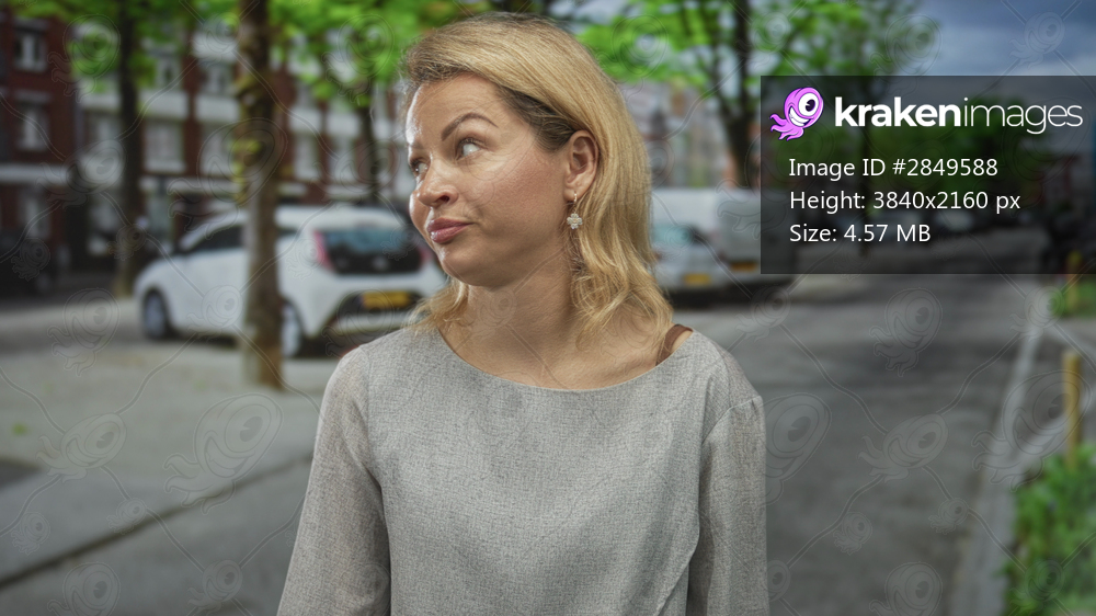 Blonde woman turns head and glances sideways revealing bare shoulder and face on city street; contemplative introspection.