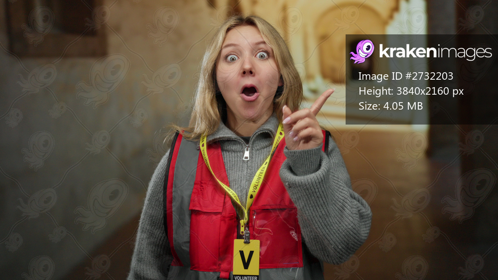 Blonde woman volunteer in thoughtful pose outdoors at an old university courtyard, wearing a red vest with a badge, surrounded by historic architecture. - Kraken Images