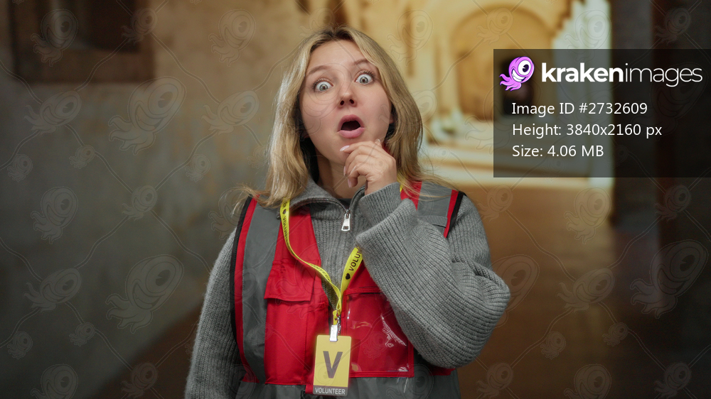 Blonde woman volunteer in thoughtful pose outdoors at an old university courtyard, wearing a red vest with a badge, surrounded by historic architecture. - Kraken Images