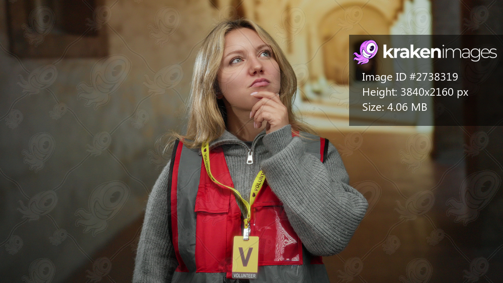 Blonde woman volunteer in thoughtful pose outdoors at an old university courtyard, wearing a red vest with a badge, surrounded by historic architecture. - Kraken Images