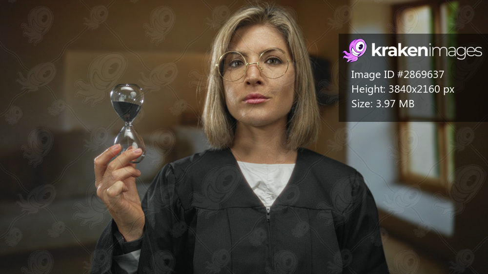 Blonde woman wearing a judicial robe holds hourglass in a building with a focused expression on her face; time reflection patience.