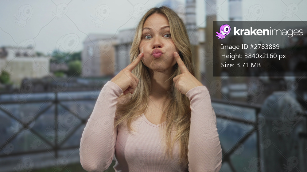 Blonde woman wearing a pink top points finger to puffed cheeks against rome street railing with blurred ruins; playfulness humor silliness.