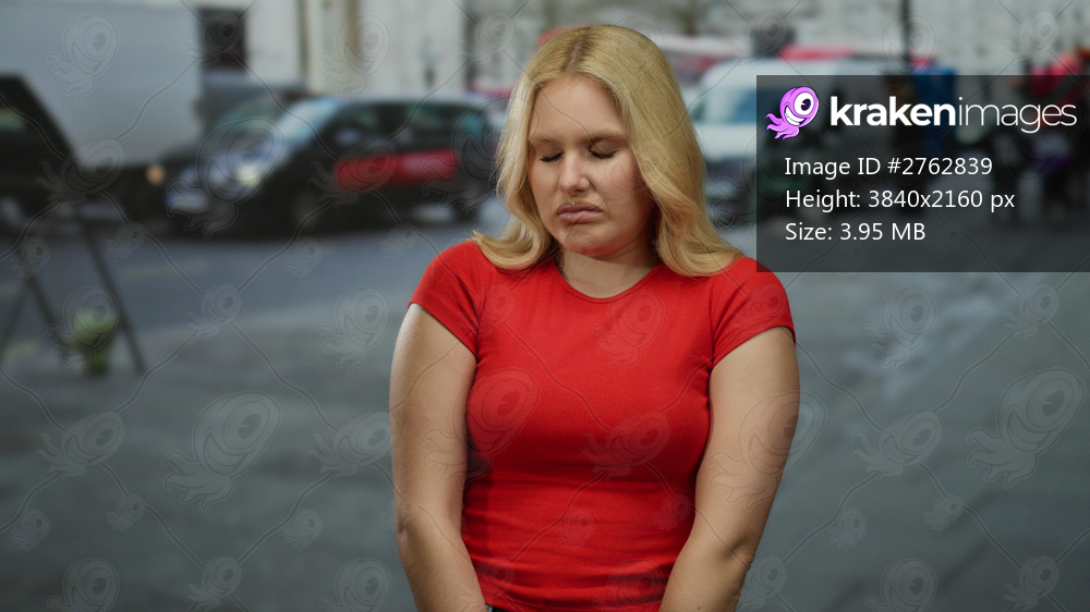 Blonde woman wearing a red shirt stands on a city street with cars in the background, capturing an outdoor urban scene with a focused expression.