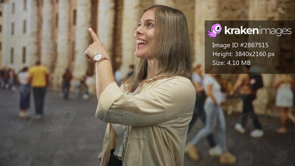 Blonde woman wearing a watch on her wrist and pointing finger toward tall stone building on crowded street; excitement.