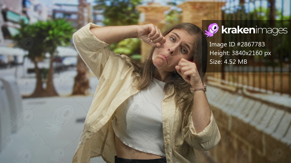 Blonde woman wearing beige shirt and white tank top pulls cheeks with fists on busy city street; sadness.
