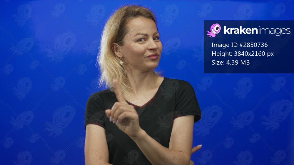 Blonde woman wearing black t shirt points finger across frame in studio with solid blue background; astonishment.