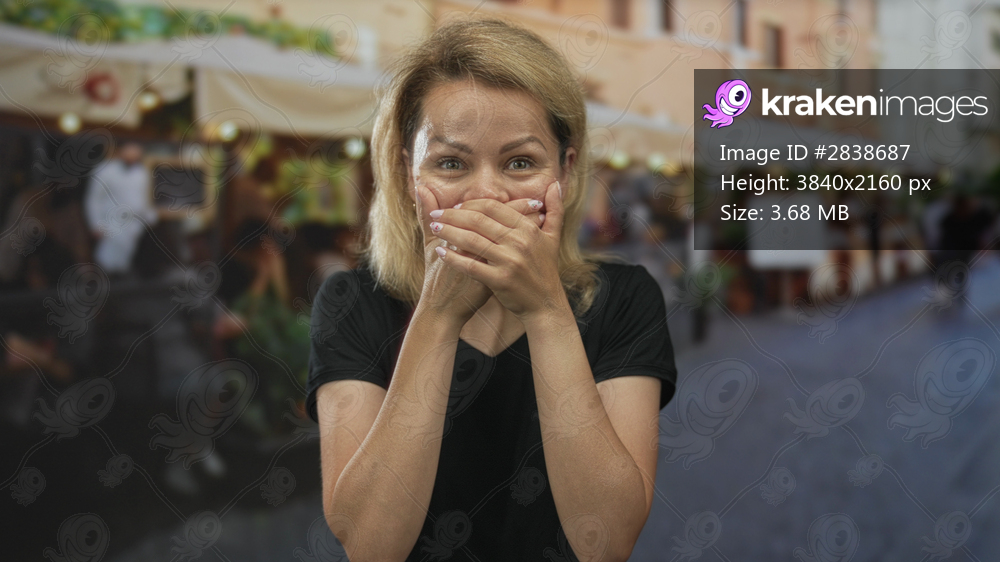 Blonde woman wearing black top covers mouth with both hands on street cafe terrace lined with tables and chairs; surprise reaction.