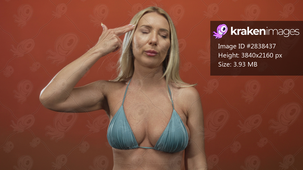 Blonde woman wearing blue bikini top finger pointing to head gesture in studio with orange wall; desperation.