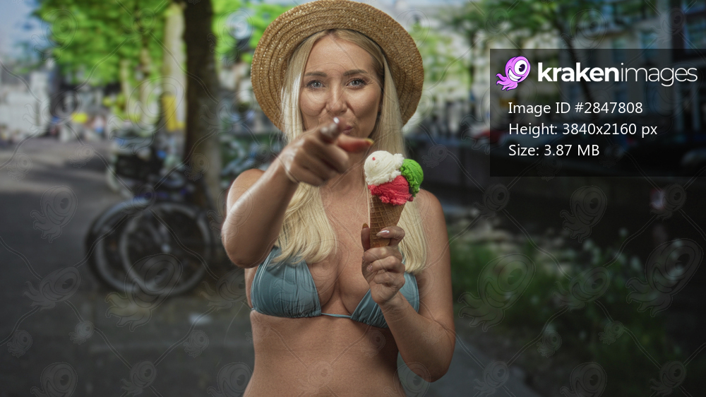 Blonde woman wearing blue bikini top pointing finger at ice cream cone on sunlit city street; summer joy.