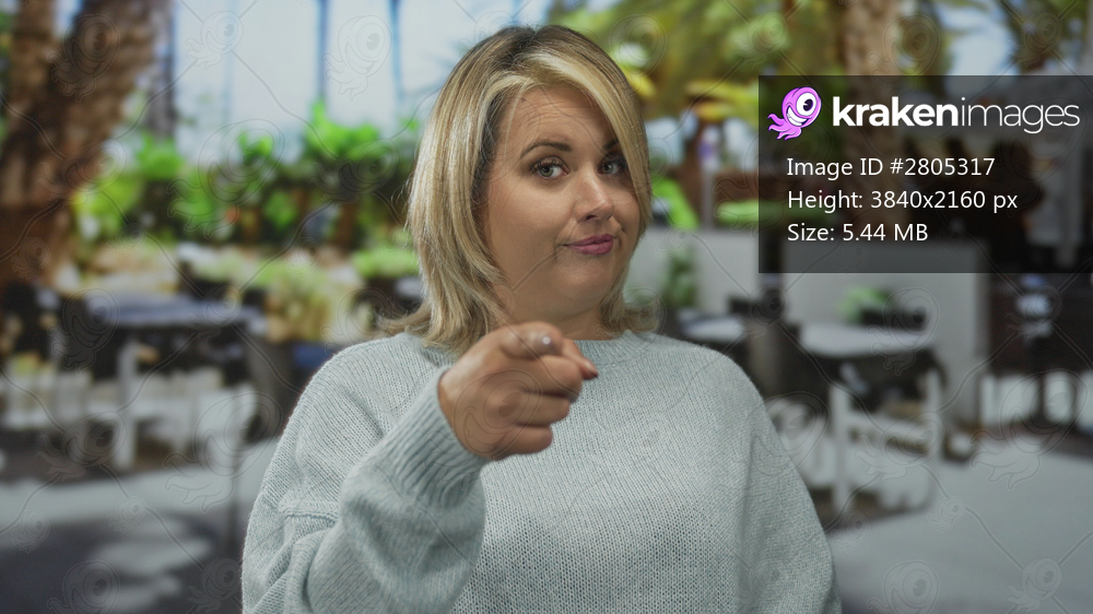 Blonde woman wearing casual sweater points finger at camera on restaurant terrace building with raised eyebrow and slight smirk; confidence.