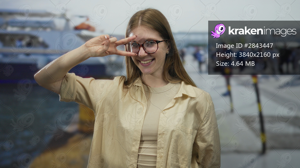 Blonde woman wearing eyeglasses smiles and makes peace sign by eye at port beside moored boats; happiness.