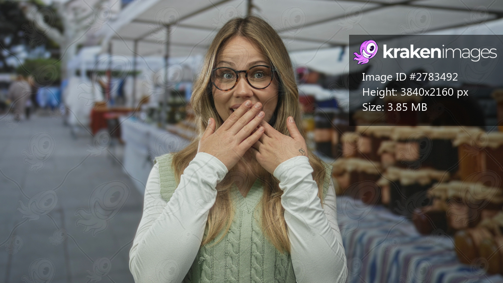 Blonde woman wearing glasses covers her mouth while laughing at an outdoor market stall; surprise happiness delight.