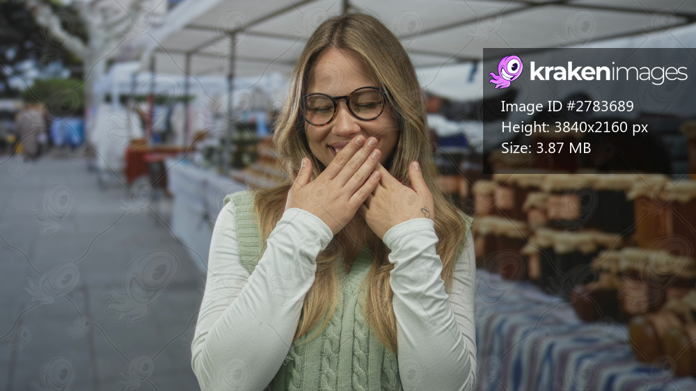 Blonde woman wearing glasses covers her mouth while laughing at an outdoor market stall; surprise happiness delight.