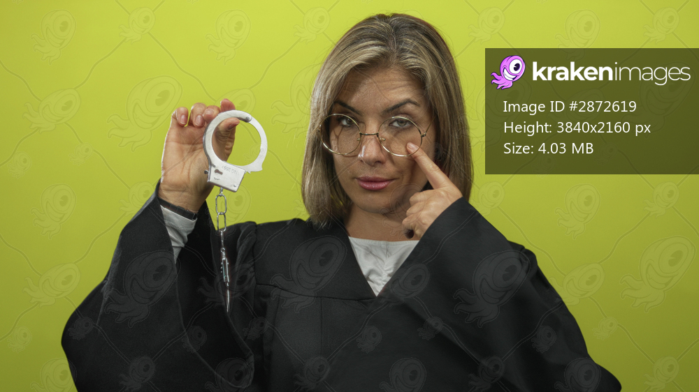 Blonde woman wearing glasses holding handcuffs points finger in studio; justice authority confidence.