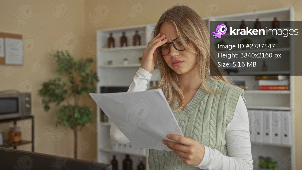 Blonde woman wearing glasses holds document with both hands and frowns at paper in office; stress focus.