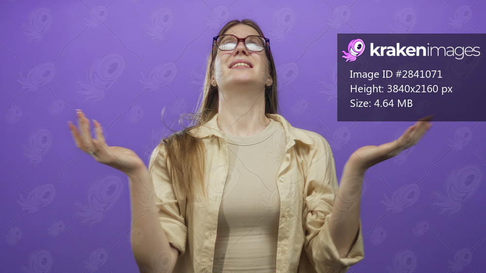 Blonde woman wearing glasses holds head with hands in a purple studio with a tense expression; frustration.