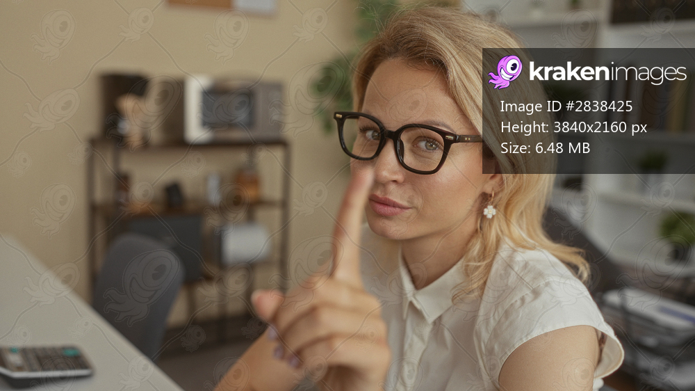 Blonde woman wearing glasses pointing finger to camera in office building; confidence focus precision assertiveness.