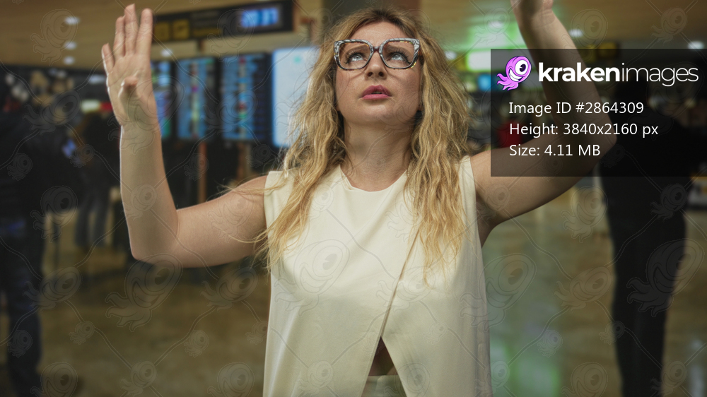 Blonde woman wearing glasses raising both hands toward departure boards in busy airport terminal; travel delay anxiety.