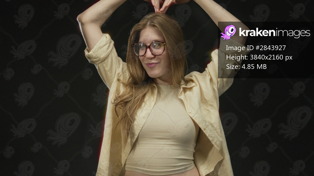 Blonde woman wearing glasses and smiling while forming heart shape with bare hands in studio under black lighting; affection joy.