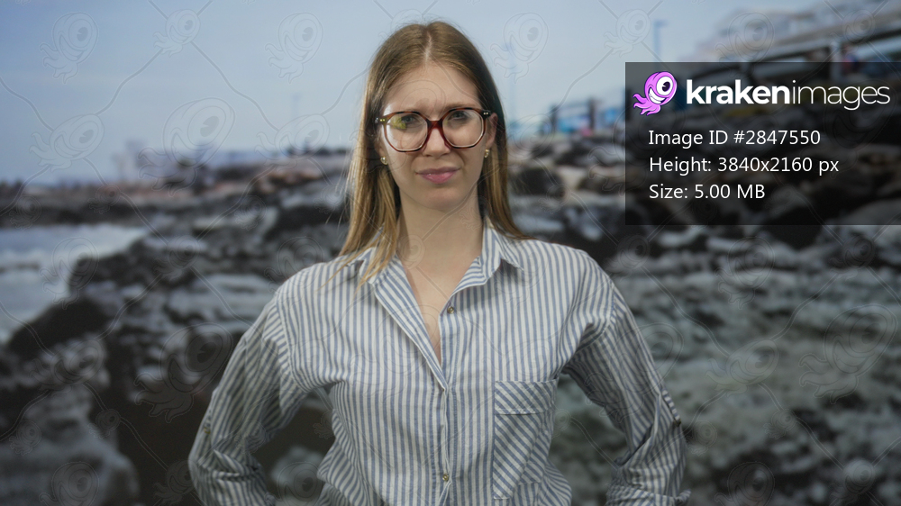 Blonde woman wearing glasses and striped shirt with hand on cheek by rocky seaside beach; doubt concern thought.