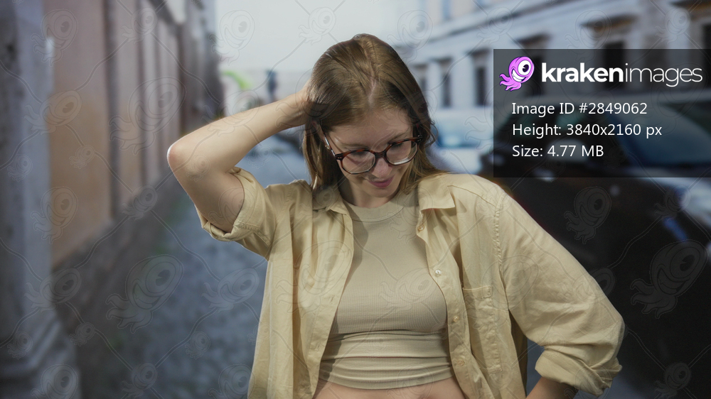 Blonde woman wearing glasses touching hair with hand on head in city street; quiet reflective contemplation.