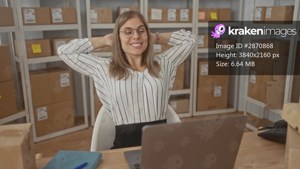 Blonde woman wearing glasses types on laptop among cardboard boxes on metal shelves in office; concentration efficiency.