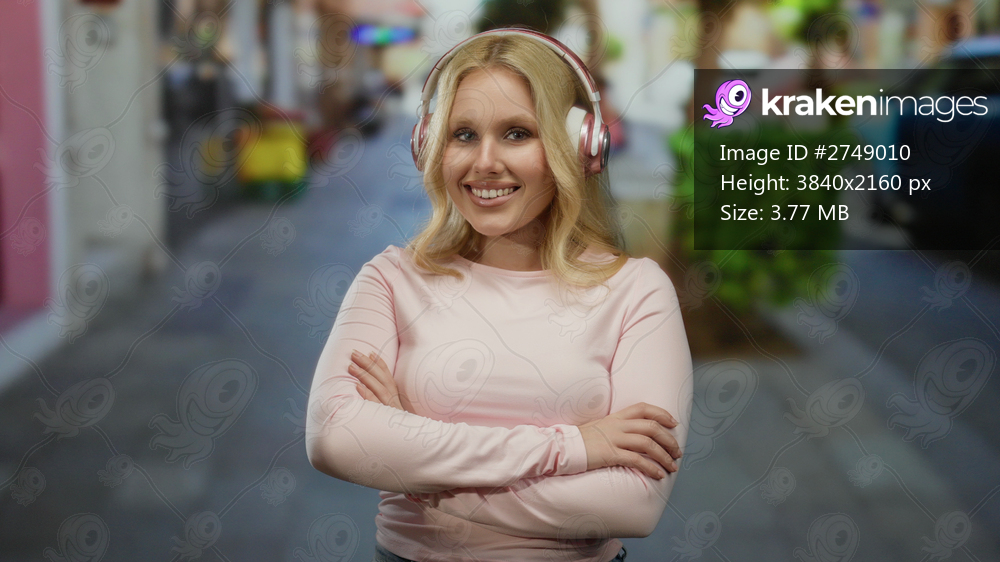Blonde woman wearing headphones stands confidently with arms crossed on a vibrant city street, embodying youthful energy and style in an urban outdoor setting. - Kraken Images