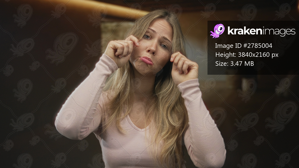 Blonde woman wearing pink top wipes tears at her eyes beside wooden table under soft warm light in room; sadness sorrow vulnerability.
