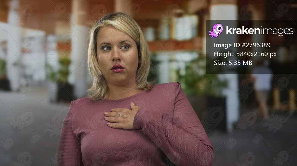 Blonde woman wearing purple blouse with hand on chest gesture on city street in bright daylight; surprise.