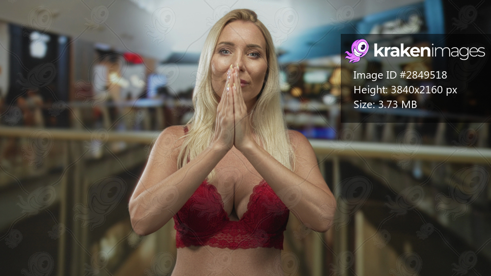 Blonde woman wearing red lace bra with clasped hands raised praying in a mall shopping center; faith hope devotion serenity.